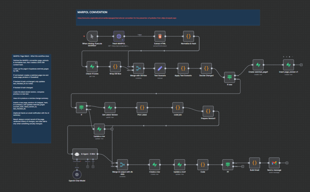 - Content Hashing: The workflow scrapes the main content of the MARPOL page and cleans the text to remove irrelevant elements like menus and footers. It then generates a unique