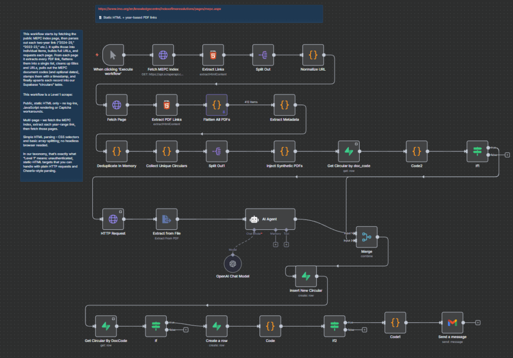Many official updates are released as PDF documents on index pages. The first workflow is designed to crawl these pages, discover new documents, and perform a deep analysis. It monitors the IMO's index for Marine Environment Protection Committee (MEPC) resolutions as a prime example.