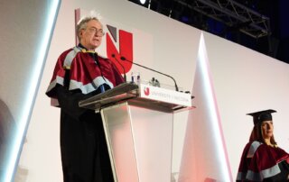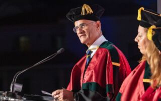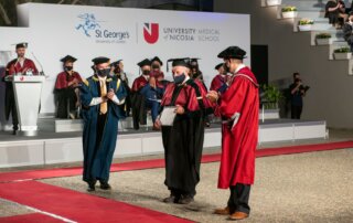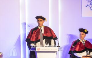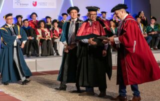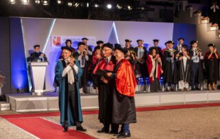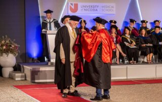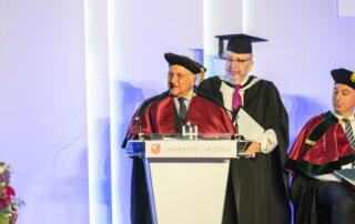 Eugene Trivizas was awarded an honorary doctorate from the University of Nicosia in recognition of his multifaceted literary creativity, expressed through fairy tales, novels, opera libretti, and theatrical works, as well as his imaginative storytelling. In his remarks, he spoke about the enduring power of narrative to nurture curiosity and optimism in young readers.