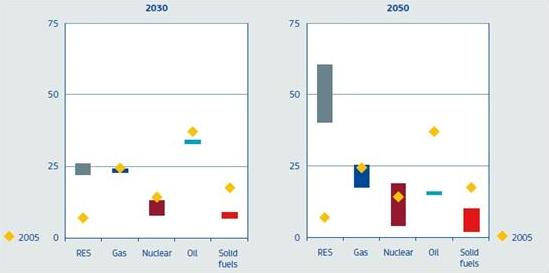 Figure 1: EU 2030 and 2050 range of fuel shares in primary energy consumption