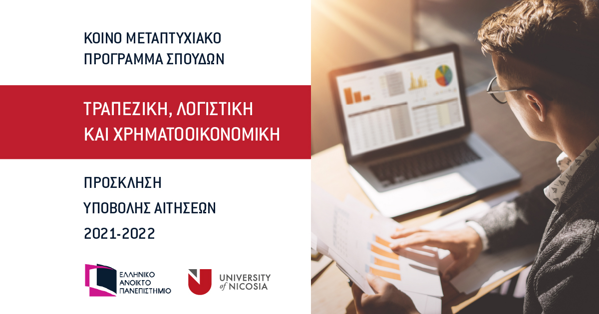Το Ελληνικό Ανοικτό Πανεπιστήμιο σύμφωνα με τις αποφάσεις της Διοικούσας Επιτροπής, προσφέρει σε συνεργασία με το Πανεπιστήμιο Λευκωσίας για το ακαδημαϊκό έτος 2021-2022, 500 θέσεις για το Κοινό Πρόγραμμα Μεταπτυχιακών Σπουδών «Τραπεζική Λογιστική και Χρηματοοικονομική».