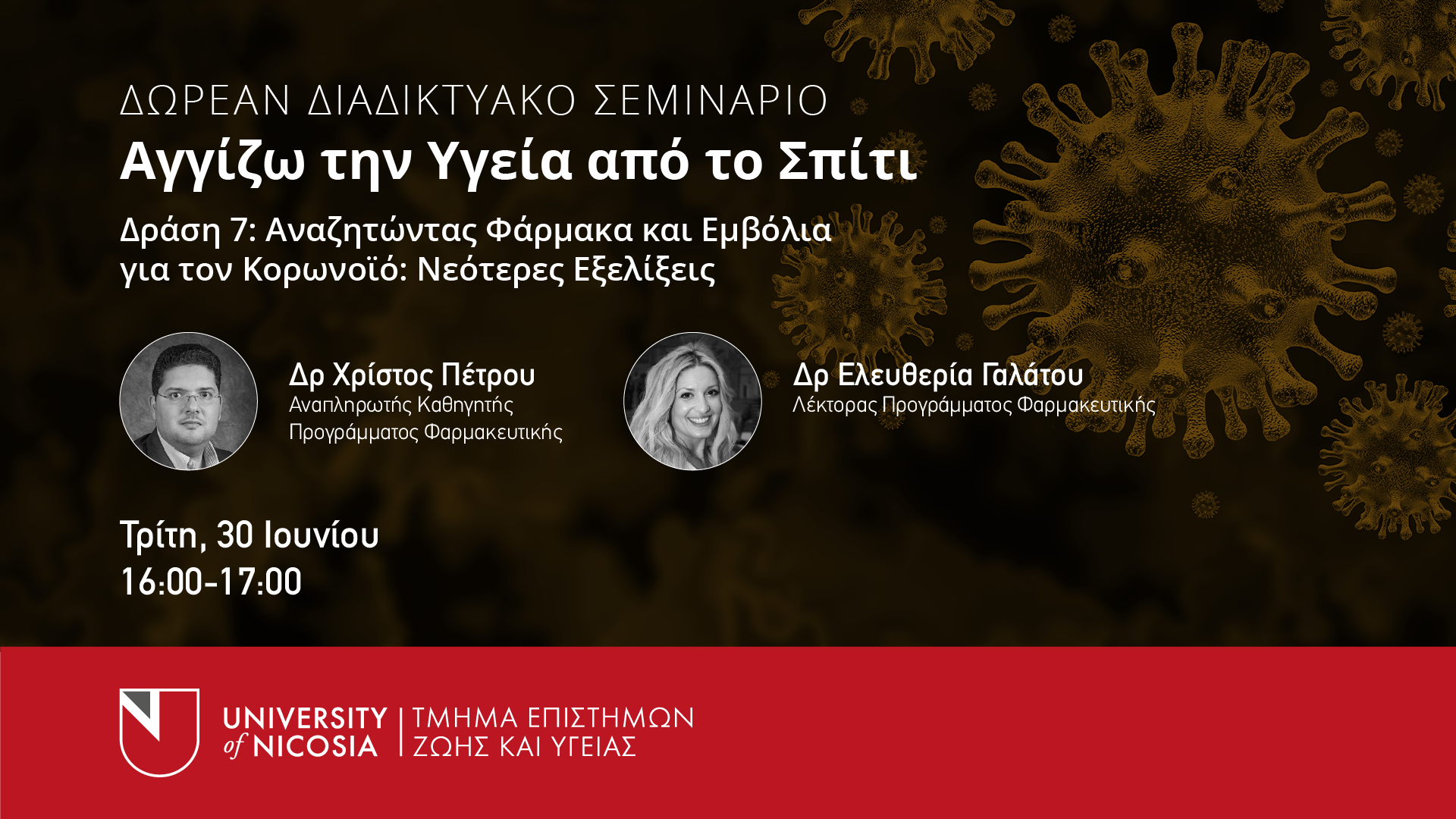 Σε όλες τις Δράσεις των σεμιναρίων «Αγγίζω την Υγεία από το Σπίτι» θα προηγηθεί σύντομος χαιρετισμός από τον Πρόεδρο του Τμήματος Επιστημών Ζωής και Υγείας, Δρ. Κυριάκο Φελέκκη.