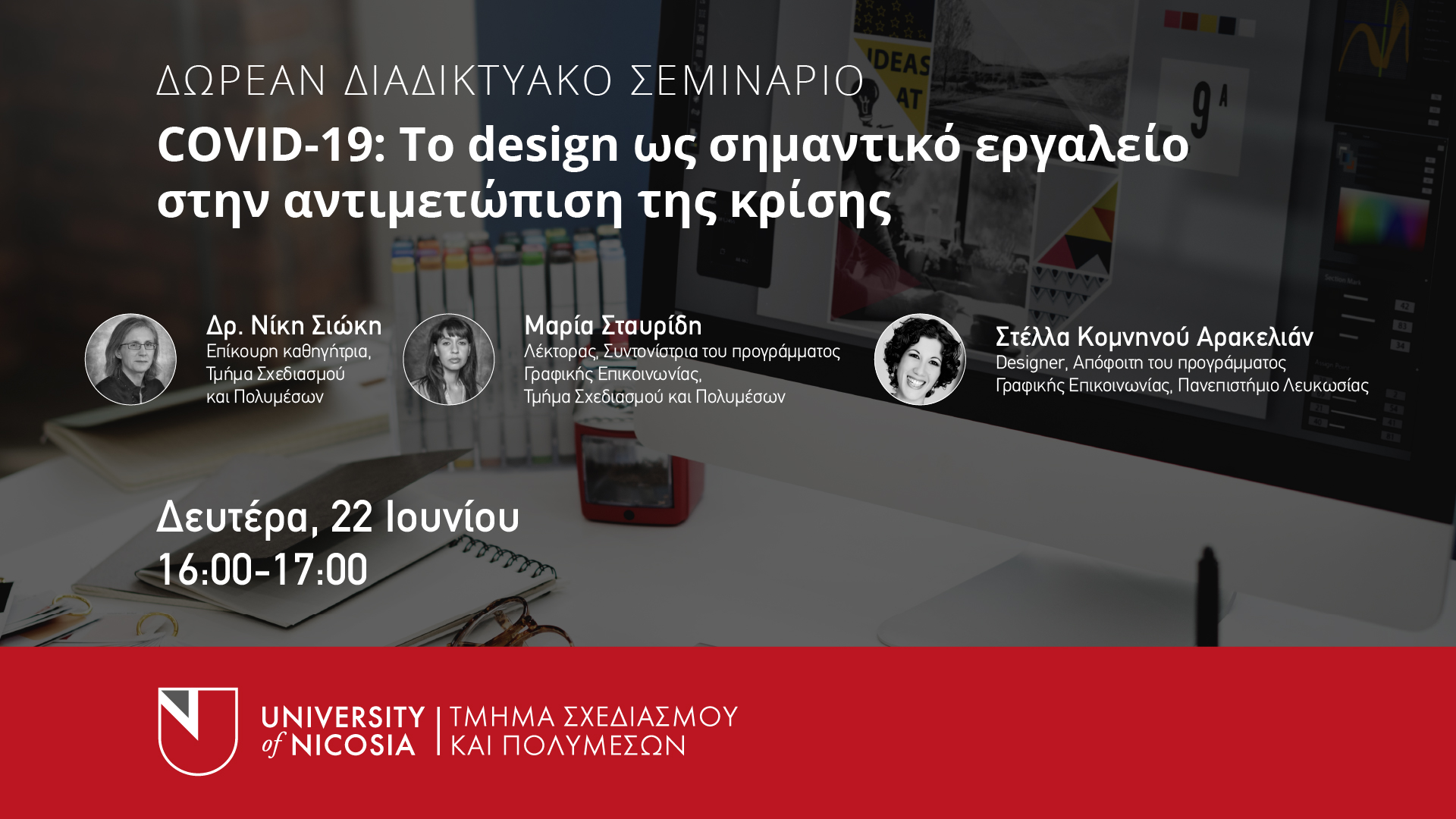 Στο διαδικτυακό σεμινάριο του προγράμματος Γραφικής Επικοινωνίας (Graphic Communication) του Πανεπιστημίου Λευκωσίας, οι εισηγητές θα συζητήσουν πώς το design χρησιμοποιήθηκε για την επίλυση προβλημάτων οπτικής επικοινωνίας στην παρούσα κρίση και πώς οι φοιτητές του προγράμματος εκπαιδεύονται να συμμετέχουν ενεργά στην αντιμετώπιση κοινωνικών ζητημάτων ως νεαροί σχεδιαστές. Η σχεδιάστρια Στέλλα Κομνηνού Αρακελιάν, απόφοιτη του προγράμματος, θα παρουσιάσει τη δουλειά της που χρησιμοποιείται στη δημόσια σφαίρα για την ενημέρωση σχετικά με τα μέτρα προφύλαξης κατά του ιού.