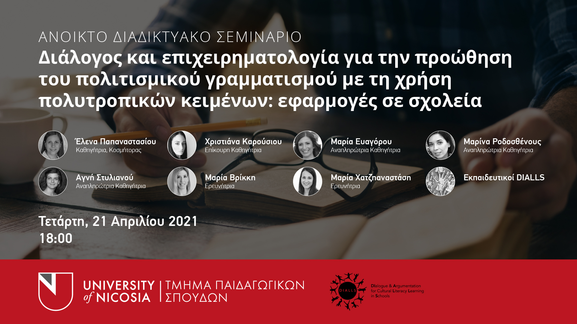 Στόχος του διαδικτυακού σεμιναρίου είναι η παρουσίαση δραστηριοτήτων που ενθαρρύνουν την καλλιέργεια του πολιτισμικού γραμματισμού και ταυτόχρονα έχουν στόχο να αναπτύξουν δεξιότητες διαλόγου και επιχειρηματολογίας μέσα από τη χρήση πολυτροπικών κειμένων (βιβλία και ταινίες μικρού μήκους χωρίς λόγια). Το σεμινάριο θα στηριχθεί σε υλικό που αναπτύχθηκε στο πλαίσιο του Ευρωπαϊκού ερευνητικού προγράμματος DIALLS σε συνεργασία με ακαδημαϊκούς και εκπαιδευτικούς από διάφορες ευρωπαϊκές χώρες.