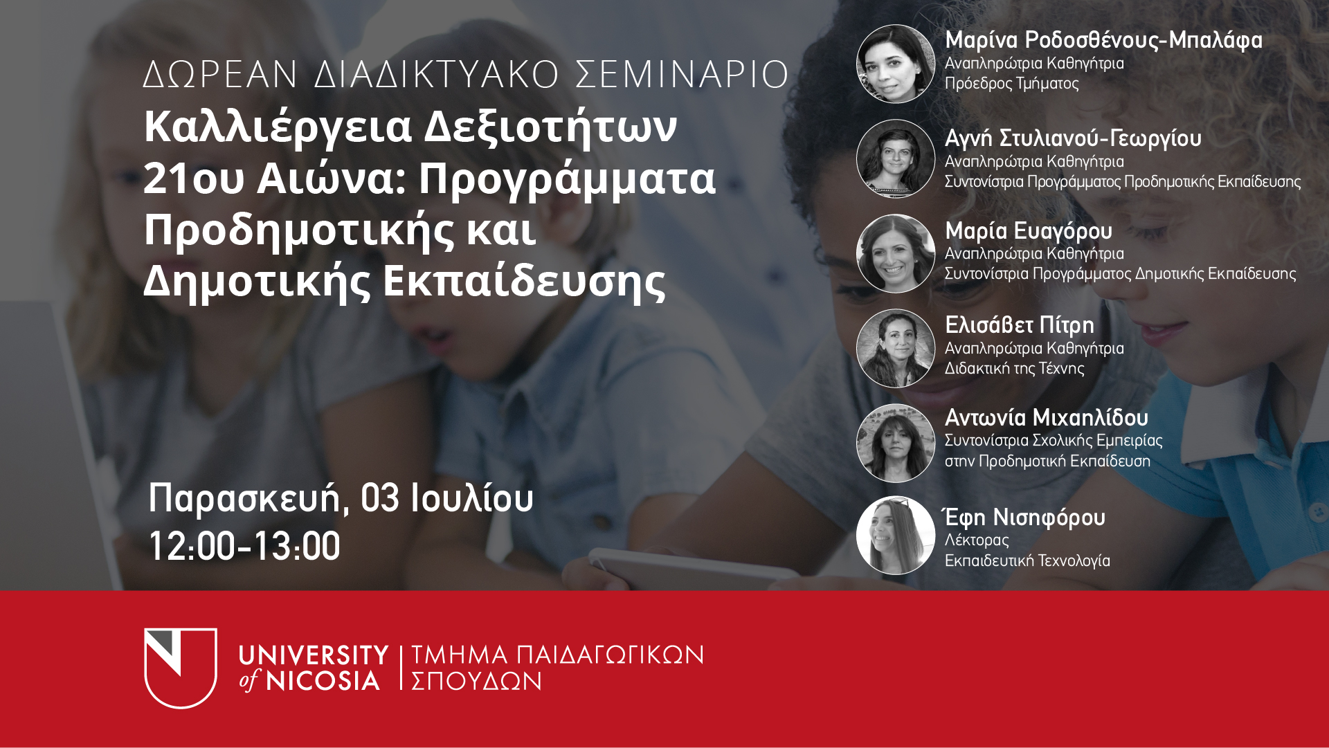Μέσα από τα Προγράμματα Σπουδών Προδημοτικής και Δημοτικής Εκπαίδευσης του Τμήματος Παιδαγωγικών Σπουδών του Πανεπιστημίου Λευκωσίας, το σεμινάριο στοχεύει να παρουσιάσει τρόπους με τους οποίους οι εκπαιδευτικοί δημοτικής και προδημοτικής εκπαίδευσης μπορούν να καλλιεργήσουν δεξιότητες 21ου αιώνα στους μαθητές τους (κριτική σκέψη, επίλυση προβλήματος, επικοινωνία, συνεργασία, δεξιότητες τεχνολογίας, καινοτομία). Θα παρουσιαστούν παραδείγματα από δραστηριότητες STEM, δημιουργικότητα και τέχνες στην εκπαίδευση.