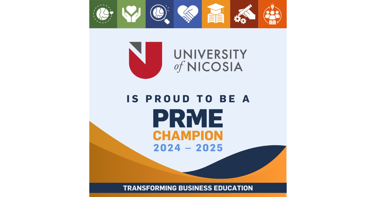 Το Πανεπιστήμιο Λευκωσίας ανακοινώνει ότι έχει επιλεγεί ως PRME Champion για τη συνομοταξία 2024-2025. Αυτή η υψηλού κύρους αναγνώριση απονέμεται από τις Αρχές για την Υπεύθυνη Εκπαίδευση στη Διοίκηση (Principles for Responsible Management Education – PRME), μια πρωτοβουλία που υποστηρίζεται από τα Ηνωμένα Έθνη.
