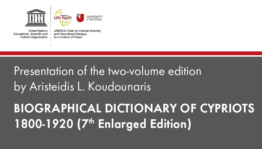 Mr Aristeidis L. Koudounaris and the UNESCO Chair of the University of Nicosia cordially invite you to the presentation of the two-volume edition by Aristeidis L. Koudounaris BIOGRAPHICAL DICTIONARY OF CYPRIOTS 1800-1920 (7th Enlarged Edition).