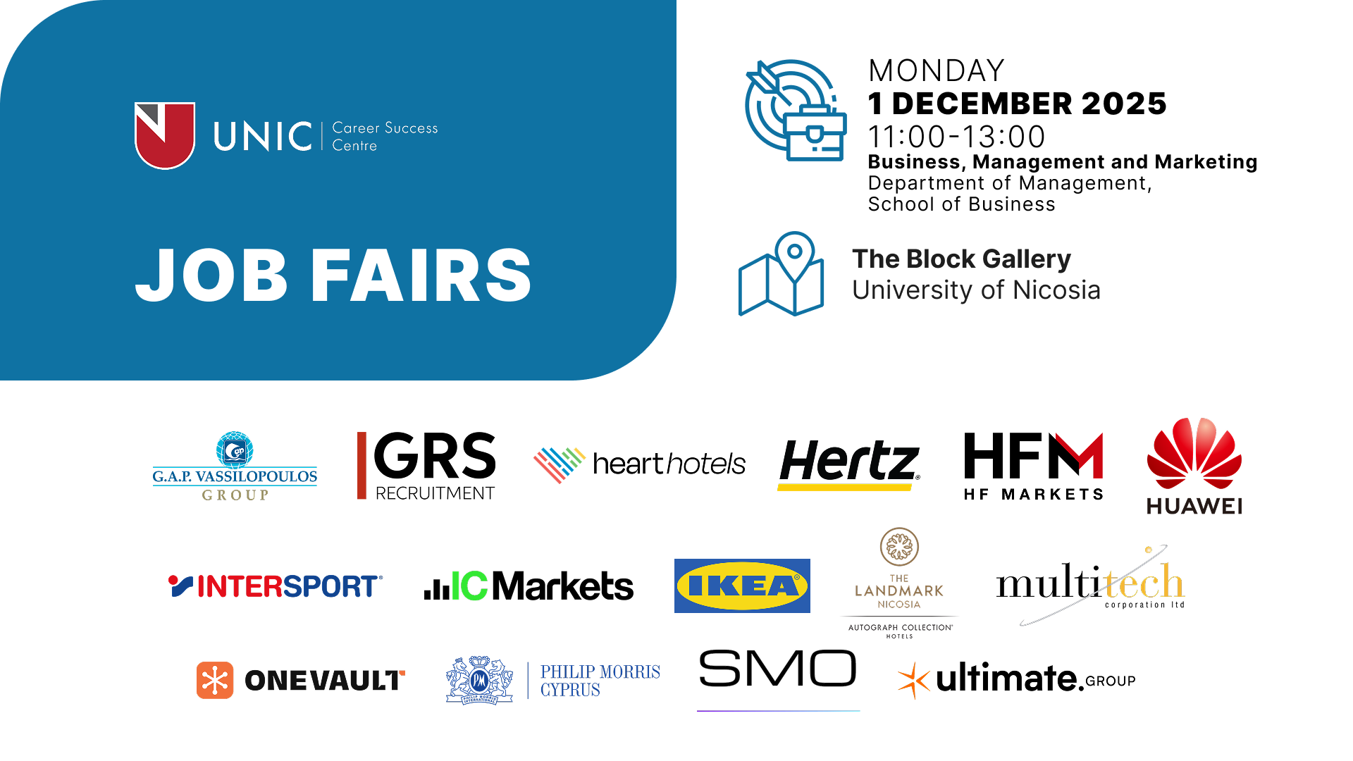 The Job Fair in Interdisciplinary Business & Marketing will be held on Monday, 1 December 2025, between 11:00-13:00, on the University Campus (The Block Gallery), and is co-organised with the Department of Management, of the UNIC School of Business.