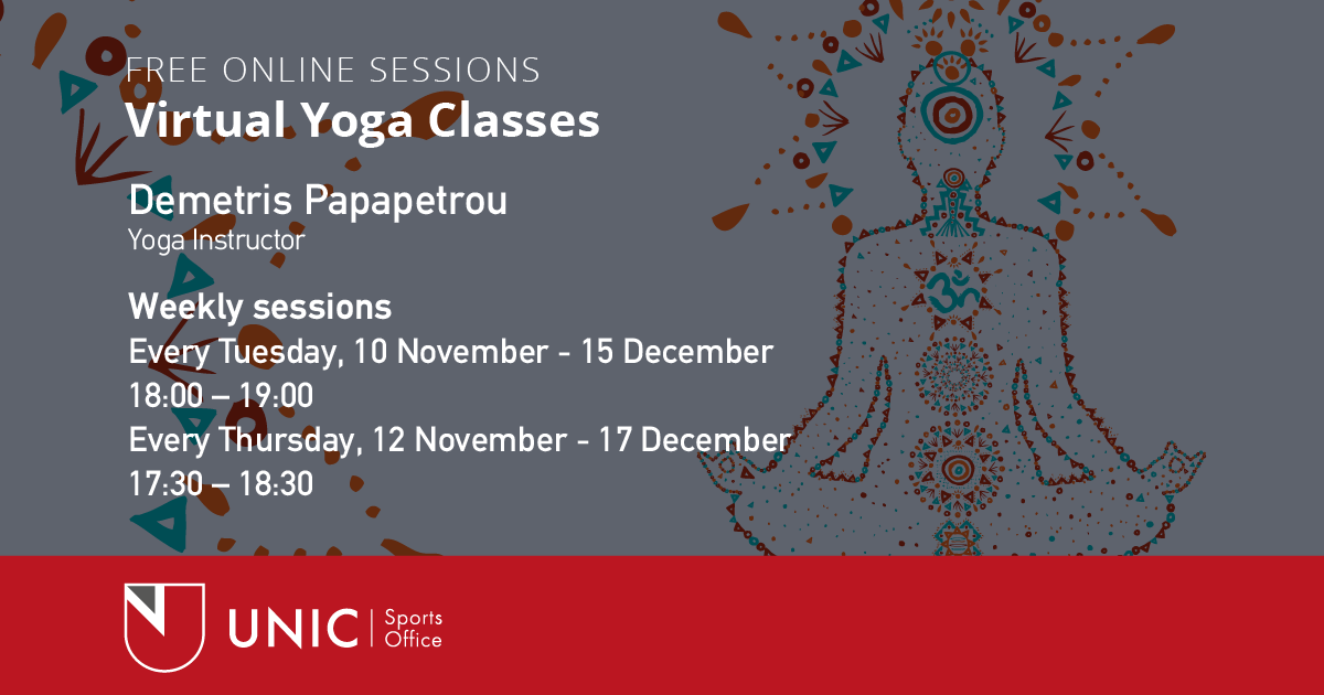 The UNIC Sports Office in collaboration with the Yoga instructor Demetris Papapetrou invites you to join the virtual yoga classes via Zoom. The sessions will take place every Tuesday (10 November – 15 December) at 18:00 and every Thursday (12 November – 17 December) at 17:30.