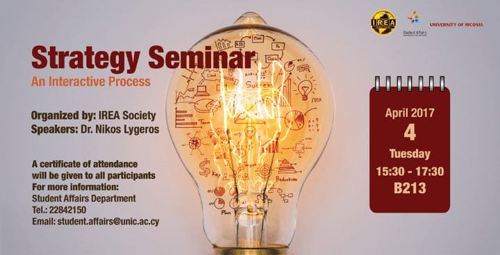 The International Relations and European Affairs (IREA) Society of the University of Nicosia is organising a seminar with the title: “Strategy: An Interactive Process”, presented by Dr. Nikos Lygeros.