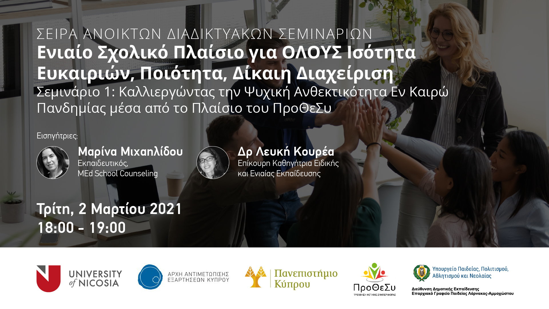 Το Πανεπιστήμιο Λευκωσίας σε συνεργασία με την Αρχή Αντιμετώπισης Εξαρτήσεων Κύπρου, το Επαρχιακό Γραφείο Παιδείας Λάρνακας-Αμμοχώστου και το Πανεπιστήμιο Κύπρου σας προσκαλούν σε διαδικτυακό σεμινάριο την Τρίτη, 02 Μαρτίου 2021 στις 18:00-19:00, με θέμα την καλλιέργεια ενός ενιαίου σχολικού πλαισίου για όλους/ες και την παροχή ισότητας ευκαιριών μέσω του Συστήματος ΠροΘεΣυ (Σχολικό Σύστημα Προώθησης Θετικής Συμπεριφοράς). Το σύστημα ΠροΘεΣυ επιδιώκει τη δημιουργία και διατήρηση θετικού και ασφαλούς κλίματος στη σχολική μονάδα με απώτερο σκοπό τη μεγιστοποίηση της μαθησιακής και κοινωνικής επίδοσης όλων των μαθητών/τριών.