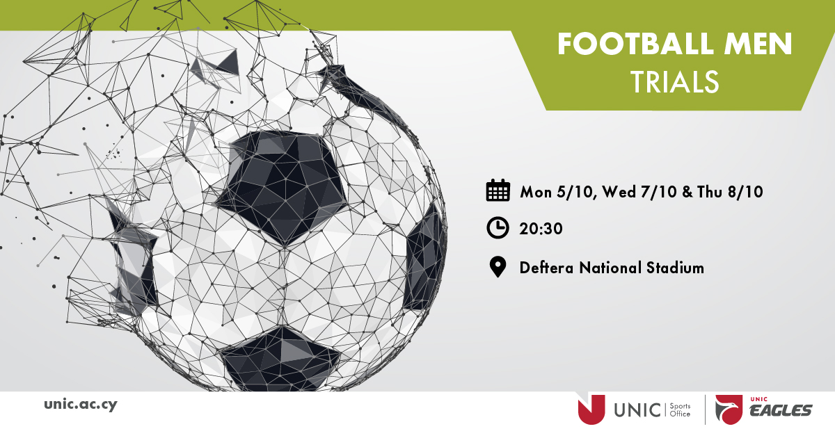 The University of Nicosia invites all men students to join UNIC Football Men’s Team. The trials will take place at Deftera National Stadium on October 5, 7 & 8 at 20:30. All full-time students are eligible to take a shot at the trials.