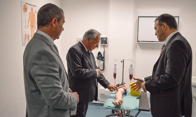 The Cyprus Minister of Health, Dr Petrides, visited the Medical School on Thursday March 6, 2014. He met with faculty and staff and toured our high-tech anatomy and clinical skills laboratories. Answering questions by journalists, the minister praised the Medical School and added that “all evaluations made by the UK General Medical Council (GMC) to date prove the exceptional work being produced at the school”. He went on to say that his Ministry will continue to support efforts so that Cyprus will become a centre for educating doctors. In his response, Course Director Dr Adonis Ioannides mentioned that the Medical School contributes to the development of doctors in Cyprus and to their continuous medical education. He added that having worked closely with the Ministry in order for Nicosia General Hospital to become a teaching hospital, the Medical School will help Limassol General Hospital prepare for the GMC Quality Assurance process and also become a teaching hospital.