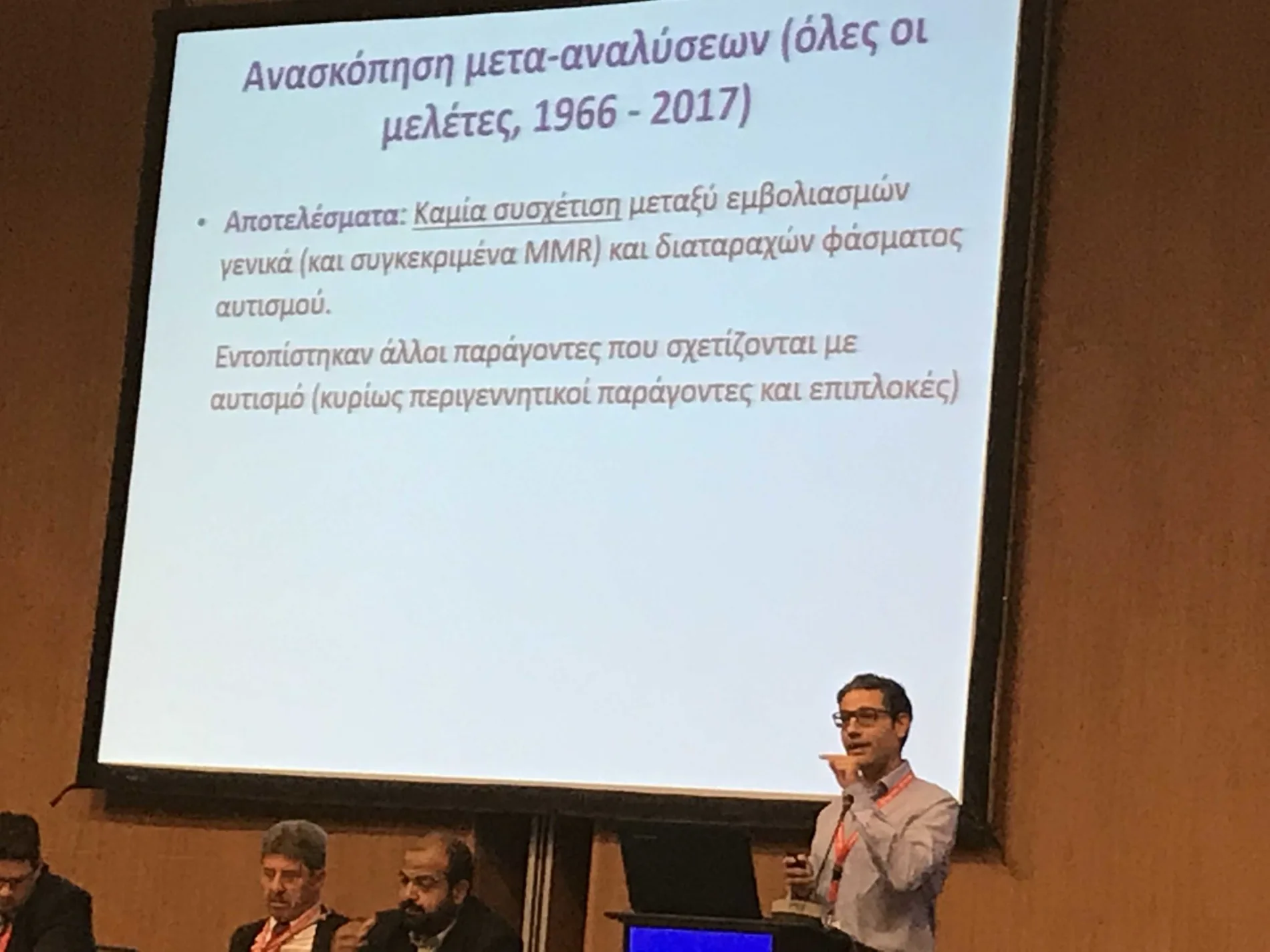 Dr Heraclides presented evidence from three large systematic reviews and meta-analyses: the first concentrating on the general side-effects of the specific vaccine, the second specifically focusing on the hypothetical link between the MMR vaccine and autism, and the third focusing on the environmental risk factors of autism. The three reviews encompassed every study that had investigated the association between MMR and autism over the past 45 years, for a total sample of more than 16 million children. All three reviews independently concluded that there is absolutely no scientific evidence linking the MMR vaccine to autism. In fact, the third review presented solid evidence for the first time environmental (i.e. non-genetic) determinants of autism, which did not include vaccination by MMR or any other vaccine.