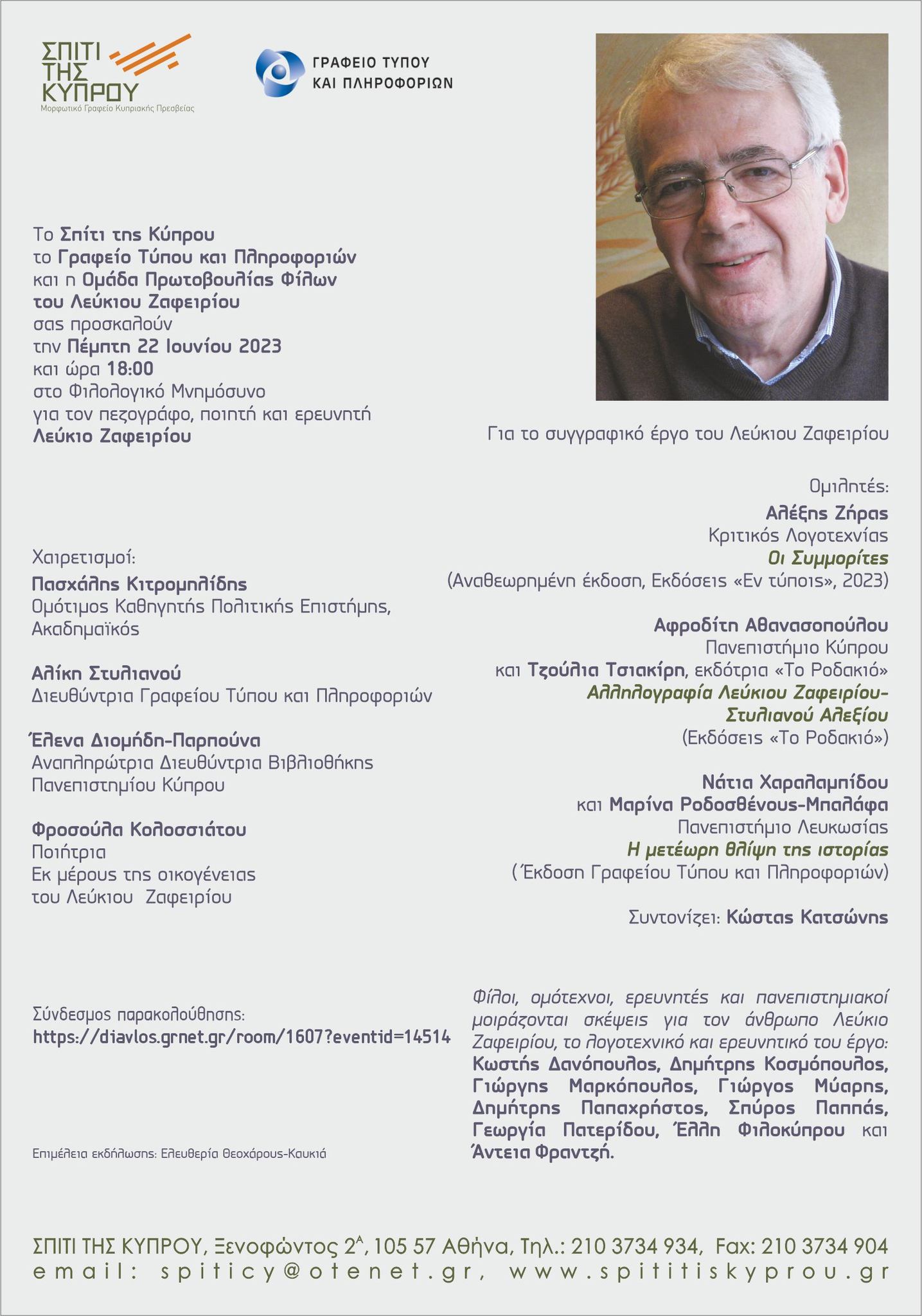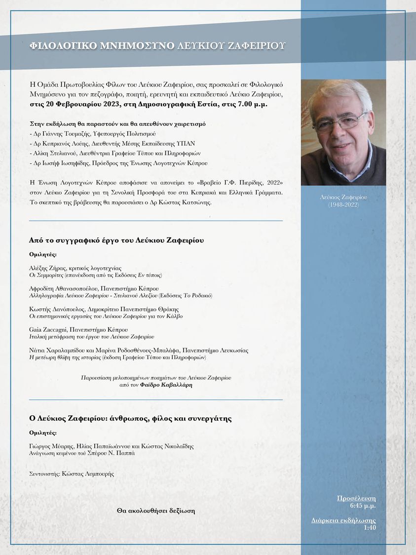 Στις 20 Φεβρουαρίου 2023 στη Λευκωσία και στις 22 Ιουνίου 2023 στο Σπίτι της Κύπρου στην Αθήνα, οργανώθηκε φιλολογικό μνημόσυνο για τον πεζογράφο, ποιητή, ερευνητή και εκπαιδευτικό Λεύκιο Ζαφειρίου. Φίλοι, ομότεχνοι και πανεπιστημιακοί, ανάμεσά τους και η Δρ Μαρίνα Ροδοσθένους, προσκλήθηκαν να μιλήσουν για το έργο του και τη φιλία που τους έδενε μαζί του. Παρουσιάστηκαν νέες εκδόσεις του έργου του και διανεμήθηκε δωρεάν το λεύκωμα με τις φωτογραφίες και τα κείμενα του ιδίου για τα κατεχόμενα με τίτλο «Η μετέωρη θλίψη της ιστορίας», μια σημαντική έκδοση του Γραφείου Τύπου και Πληροφοριών, πάνω στην οποία δούλεψε ο Ζαφειρίου και το ΓΤΠ για χρόνια, σε άμεση συνεργασία με την Έδρα Unesco του Πανεπιστημίου Λευκωσίας.