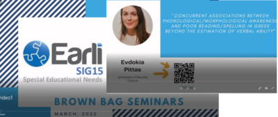 Pittas, E. (Invited speaker). Concurrent associations between phonological/morphological awareness and poor reading/spelling in Greek beyond estimation of verbal ability. EARLI weekly seminars, 29 March 2022. Virtual.