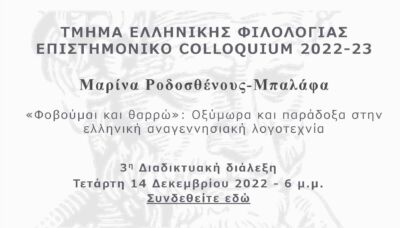 Ροδοσθένους-Μπαλάφα, Μ. (2022, Δεκέμβριος). «Φοβούμαι και θαρρώ»: Οξύμωρα και παράδοξα στην ελληνική αναγεννησιακή λογοτεχνία. Διάλεξη στο Διαδικτυακό Επιστημονικό Colloquium του Τμήματος Ελληνικής Φιλολογίας – Δημοκρίτειου Πανεπιστήμιου Θράκης.