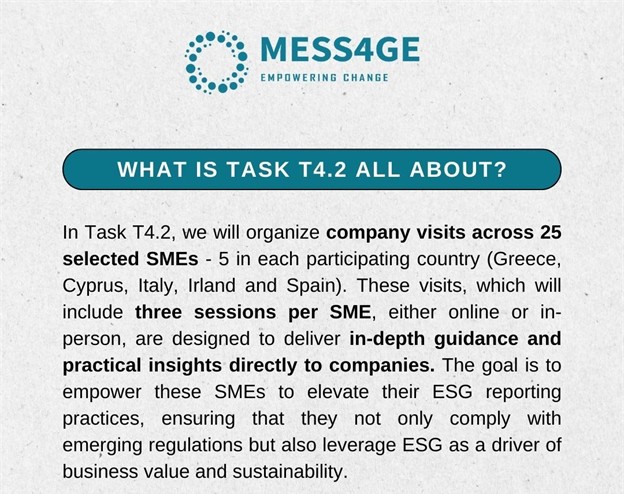 Task T4.2, “ESG Reporting: Company Visits,” is a cornerstone of our strategy to provide hands-on support and foster a culture of sustainability across Europe’s SMEs.