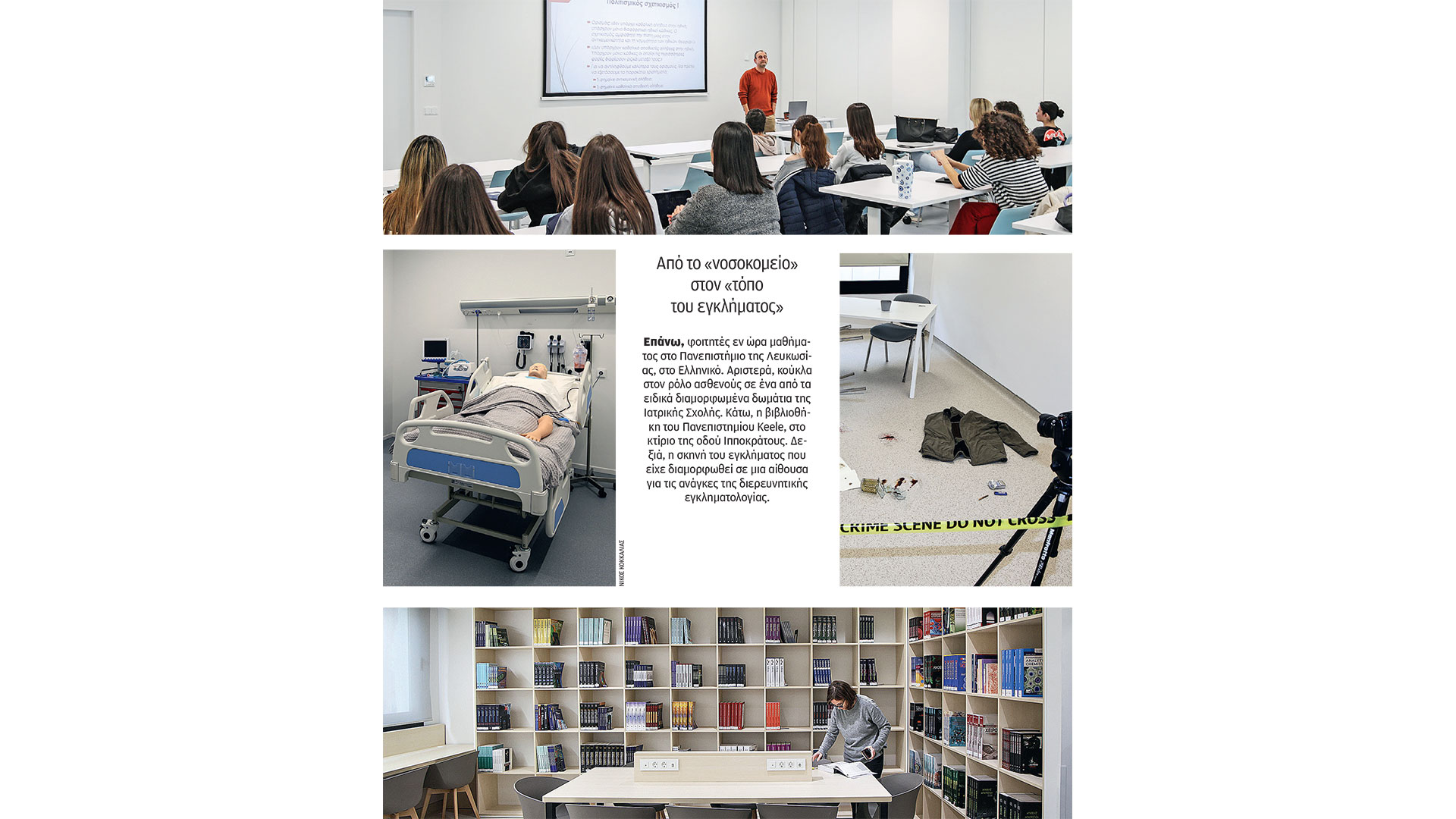 Ετσι, προς το παρόν στο κτίριο της Ιπποκράτους διδάσκονται θεωρητικά μαθήματα, χωρίς να είναι τόσο απαραίτητα τα πλήρως εξοπλισμένα εργαστήρια. Τις εντυπώσεις μας έκλεψε η σκηνή του εγκλήματος που είχε διαμορφωθεί σε μια αίθουσα για τις ανάγκες της διερευνητικής εγκληματολογίας: αίματα στο πάτωμα, το τζάκετ του θύματος, ένα πακέτο τσιγάρων και μια κιτρινόμαυρη κορδέλα που απαιτούσε «crime scene do not cross». Επίσης, στο παράρτημα του πανεπιστημίου έχει οργανωθεί μια αίθουσα δικαστηρίου, με τα έδρανα των δικαστών, των κατηγορουμένων, των δικηγόρων, των μαρτύρων, του ακροατηρίου. Σε άλλον όροφο υπάρχουν αίθουσες με κρεβάτια νοσοκομείου στα οποία υπάρχουν κούκλες ως ασθενείς, «οι οποίες ιδρώνουν, έχουν αρρυθμίες», όπως λέει ο κ. Ζώρας. Για το δύσκολο μάθημα της Ανατομίας όλα θα είναι ψηφιακά, «καθώς δεν είναι απαραίτητο να υπάρχει η αίσθηση του πτώματος», όπως συμπληρώνει ο πρύτανης. Οσο για τα κλινικά μαθήματα, η ηγετική ομάδα του πανεπιστημίου αναφέρει ότι «οι Εγγλέζοι μας έχουν ζητήσει να δίνουμε πληθώρα εμπειριών στους φοιτητές. Αρα έχουμε συνάψει συνεργασίες με μεγάλο δίκτυο κλινικών πλαισίων, όπως κέντρα υγείας, νοσοκομεία, εξειδικευμένες κλινικές», παρατηρεί ο κ. Αρκουμάνης. Καθώς το παράρτημα βρίσκεται ακόμη στη φάση ανάπτυξης και προετοιμασίας προγραμμάτων σπουδών, τα στελέχη του επικεντρώνονται στα προβλήματα που αντιμετώπισαν κατά τη φάση έως την πιστοποίηση των υπαρχόντων. «Η ΕΘΑΑΕ καθυστέρησε πολύ, με αποτέλεσμα να ξεκινήσουμε τον Νοέμβριο. Από την άλλη, το πρόγραμμα της Ιατρικής του Keele Greece ως εξαετές πρέπει να είναι εγκεκριμένο από το μητρικό ίδρυμα. Πρέπει να συγκεράσουμε την αγγλική φιλοσοφία στην ανάπτυξη των προγραμμάτων με την ελληνική», λέει ο κ. Ζώρας.