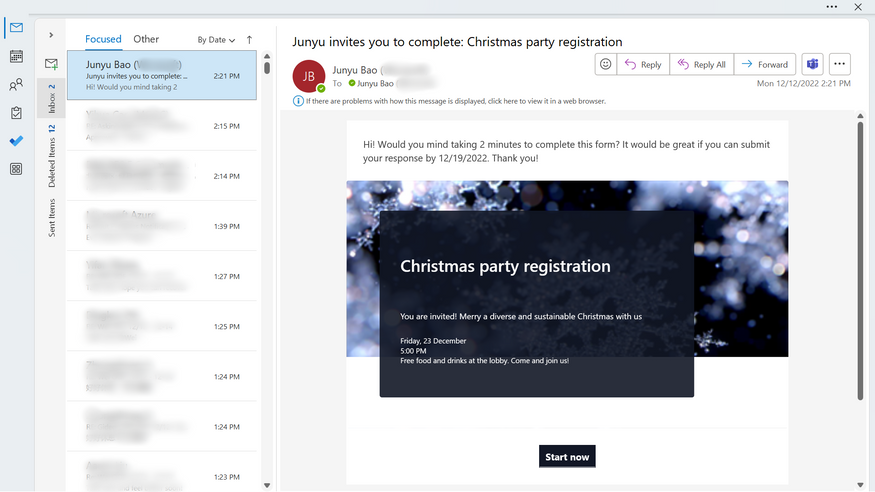 We enhanced the distribution feature of Forms to give designers a simple and quick approach to create an appealing invitation message on various channels for various sending intentions. While providing forms and quizzes to respondents both online and offline, users would enjoy advanced distribution experience. When you send your form/quiz through Outlook, what the form looks like is shown below. A cover page you added to the form will also be displayed in the email.