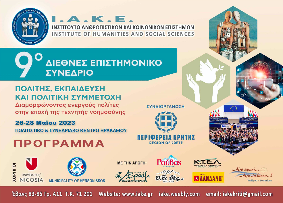 Στις 26-28 Μαΐου 2023, θα πραγματοποιηθεί το 9ο Διεθνές Συνέδριο του Ινστιτούτου Ανθρωπιστικών και Κοινωνικών Επιστημών, με θέμα: «ΠΟΛΙΤΗΣ, ΕΚΠΑΙΔΕΥΣΗ ΚΑΙ ΠΟΛΙΤΙΚΗ ΣΥΜΜΕΤΟΧΗ: Διαμορφώνοντας ενεργούς πολίτες στην εποχή της τεχνητής νοημοσύνης», που διοργανώνεται στο Πολιτιστικό και Συνεδριακό Κέντρο Ηρακλείου Κρήτης.